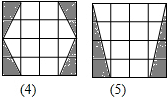 18.仔细观察图(1)、图(2)、图(3)中阴影部分图案的共同特征,在图(4)、图(5)中再设计两幅具备上述特征的图案.(每小格面积为1)分析 根据图可得图(1)、图(2)、图(3)中阴影部分面积为4,都是轴对称图形,然后根据此特征画出图形即可.