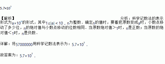 某公司在埃及新投产一座鸡饲料厂,年生产饲料可饲养57000000只肉鸡,这个数据用科学记数法可表示为______.
