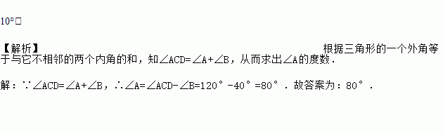 如图,在△ABC中,点D是BC延长线上一点,∠B=40°,∠ACD=120°,则∠A的余角是_________.