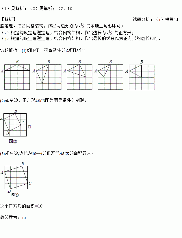 (1)见解析;(2)见解析;(3)10 【解析】试题分析:(1)根据勾股定理,结合网格结构,作出两边分别为的等腰三角形即可; (2)根据勾股定理逆定理,结合网格结构,作出边长为的正方形; (3)根据勾股定理逆定理,结合网格结构,作出最长的线段作为正方形的边长即可. 试题解析:(1)如图①,符合条件的C点有5个: (2)如图②,正方形ABCD即为满足条件的图形: ; ...