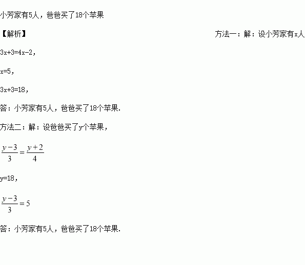 爸爸买了一箱苹果回家,小芳想分给家里的每一个人,如果每人分3个,就剩下3个苹果分不完,如果每人分4个,则还差2个苹果才够分,问小芳家有几个人?爸爸买了多少个苹果?