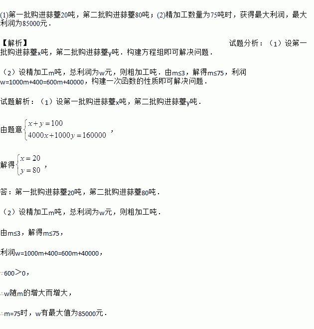 某蔬菜加工公司先后两批次收购蒜薹(tái)共100吨.第一批蒜薹价格为4000元/吨;因蒜薹大量上市,第二批价格跌至1000元/吨.这两批蒜薹共用去16万元.