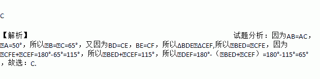 C 【解析】试题分析:因为AB=AC,∠A=50°,所以∠B=∠C=65°,又因为BD=CE,BE=CF,所以ΔBDE≌ΔCEF,所以∠BED=∠CFE,因为∠CFE+∠CEF=180°-65°=115°,所以∠BED+∠CEF=115°,所以∠DEF=180°-(∠BED+∠CEF)=180°-115°=65°,故选:C.