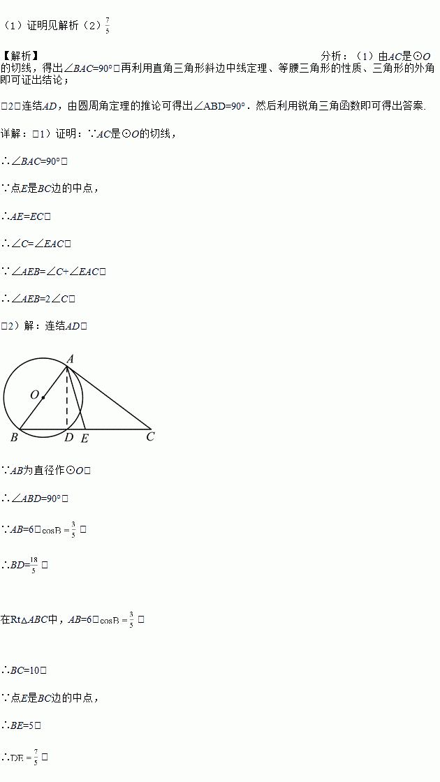 如图,以AB为直径作⊙O,过点A作⊙O的切线AC,连结BC,交⊙O于点D,点E是BC边的中点,连结AE.