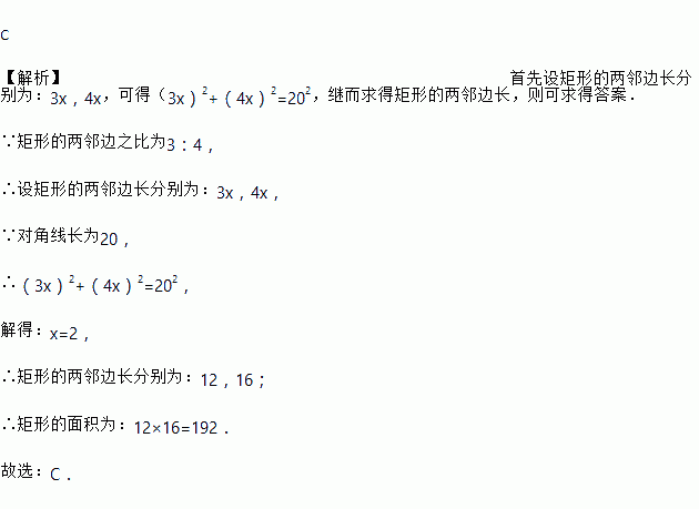 矩形的对角线长为20,两邻边之比为3 : 4,则矩形的面积为( )