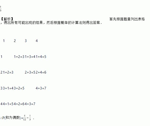 从1,2,3,4四个数中任意取出2个数做加法,其和为偶数的概率是_________.