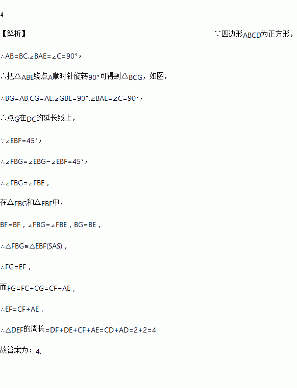 如图,正方形ABCD的边长为2,点E,F分别在边AD,CD上,若∠EBF=45°,则△EDF的周长等于_____.