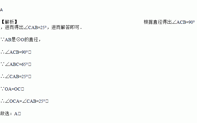 AB是⊙O的直径,点C在圆上,∠ABC=65°,那么∠OCA的度数是( )