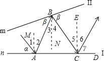 光线以如图所示的角度α照射到平面镜上,然后在平面镜Ⅰ、Ⅱ间来回反射,已知α=60,β=50,则γ=________度.