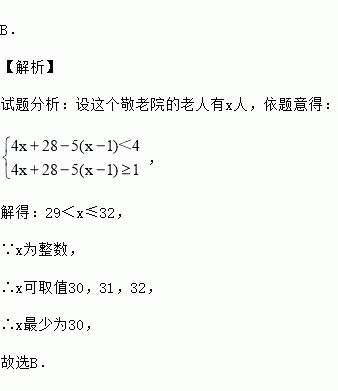 某校学生志愿服务小组在“学雷锋”活动中购买了一批牛奶到敬老院慰问老人.如果分给每位老人4盒牛奶,那么剩下28盒牛奶;如果分给每位老人5盒牛奶,那么最后一位老人分得的牛奶不足4盒,但至少1盒,则这个敬老院的老人最少有