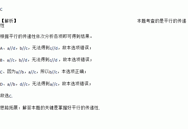 C. 因为a // b,a // c,所以b // c; D. 因为a // b,c // d,所以a // c.