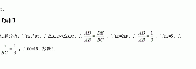 如图,在△ABC中,点D在边AB上,BD=2AD,DE∥BC交AC于点E,若线段DE=5,则线段BC的长为( )