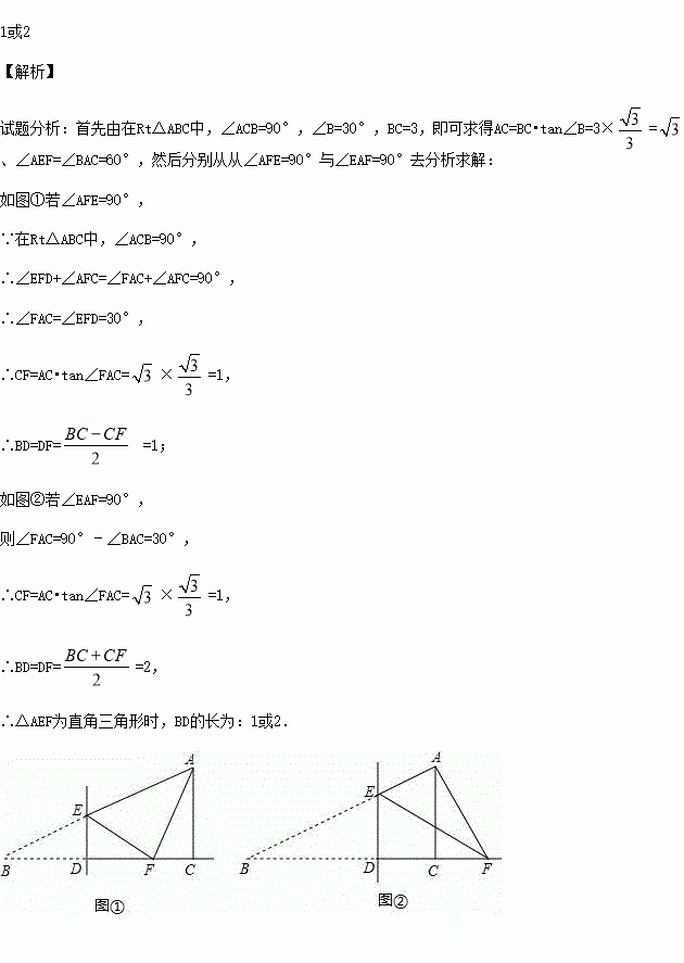 如图,在Rt△ABC中,∠ACB=90°,∠B=30°,BC=3.点D是BC边上的一动点(不与点B、C重合),过点D作DE⊥BC交AB于点E,将∠B沿直线DE翻折,点B落在射线BC上的点F处.当△AEF为直角三角形时,BD的长为 .