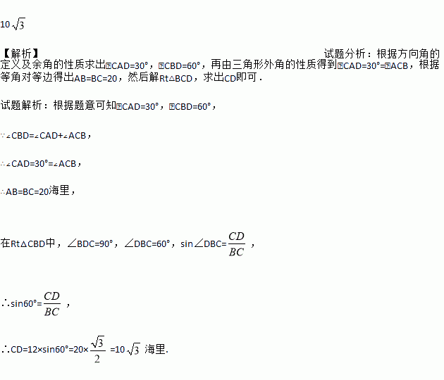 如图,一渔船由西往东航行,在A点测得海岛C位于北偏东60°的方向,前进20海里到达B点,此时,测得海岛C位于北偏东30°的方向,则海岛C到航线AB的距离CD等于_______海里.