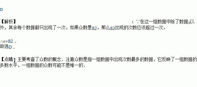 若数据80,82,79,69,74,78,81,的众数是82,则( )。