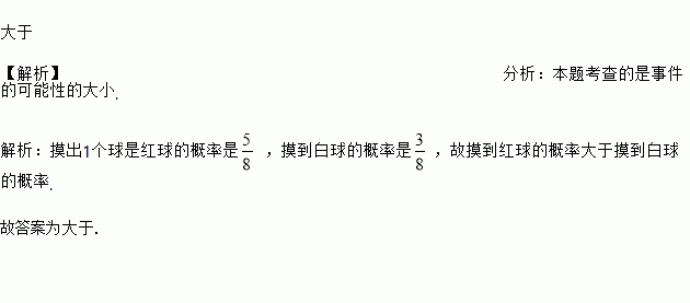 袋子里有5只红球,3只白球,每只球除颜色以外都相同,从中任意摸出1只球,是红球的可能性________(选填“大于”“小于”或“等于”)是白球的可能性.