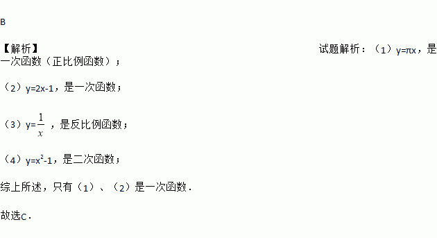 下列函数(1)y=πx (2)y=2x-1 (3)y= (4)y=22-x (5)y=x2-1中,一次函数的个数是( )