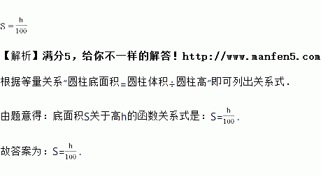 圆柱的体积是100,圆柱的底面积S与高h的关系式是________________.