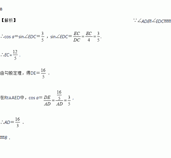 如图所示,在矩形ABCD中,DE⊥AC于E,设∠ADE=a,且cos a=,AB=4,则AD的长为 ( )