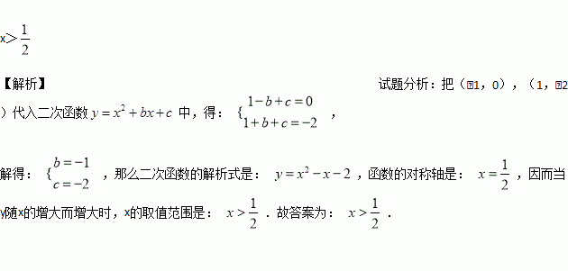如图,已知二次函数y=x2+bx+c的图象经过点(﹣1,0),(1,﹣2),当y随x的增大而增大时,x的取值范围是 .