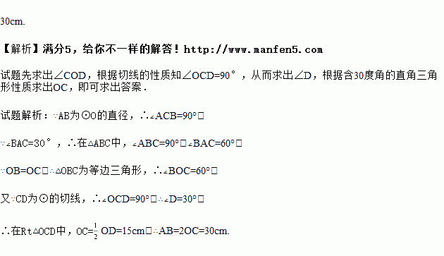 如图,已知⊙O中直径AB与弦AC的夹角为30°,过点C作⊙O的切线交AB的延长线于点D,OD=30 cm.求直径AB的长.