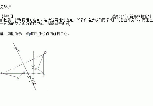 如图,△DEF是由△ABC通过一次旋转得到的,请用直尺和圆规画出旋转中心.