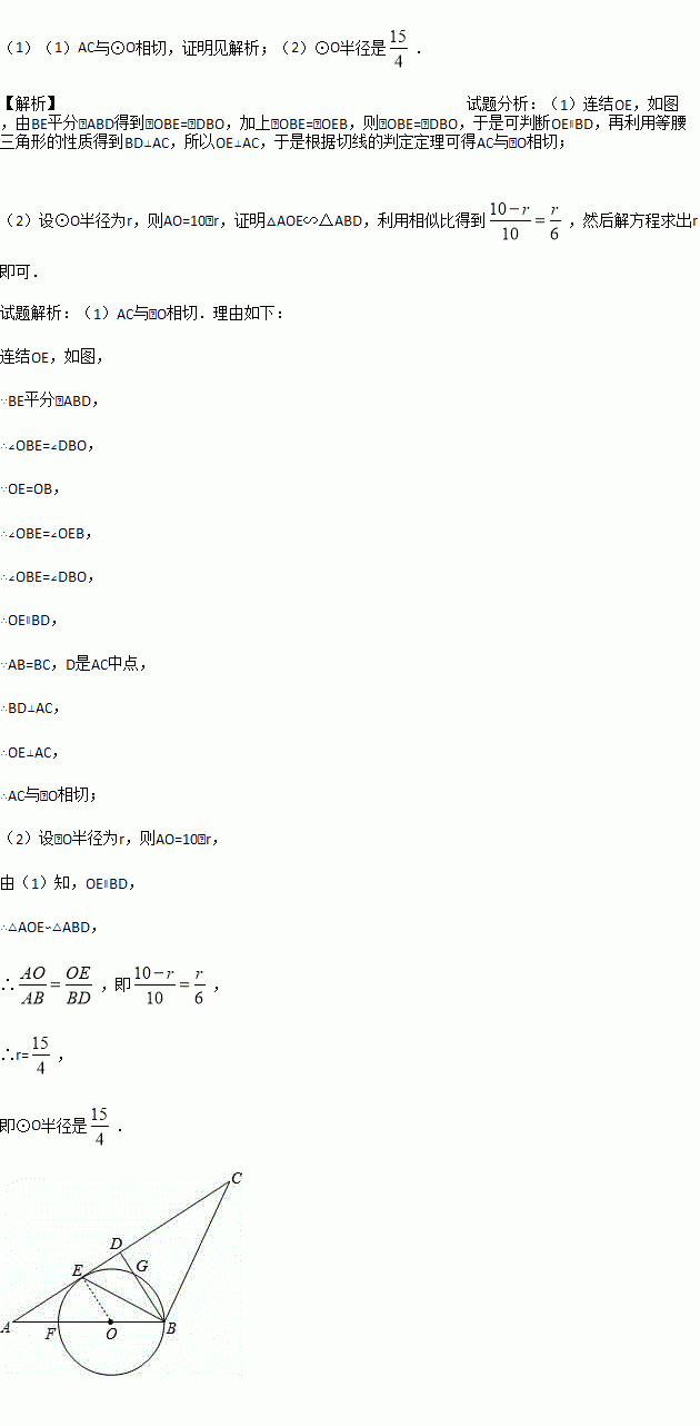 如图,在△ABC中,AB=BC,D是AC中点,BE平分∠ABD交AC于点E,点O 是AB上一点,⊙O过B、E两点,交BD于点G,交AB于点F.