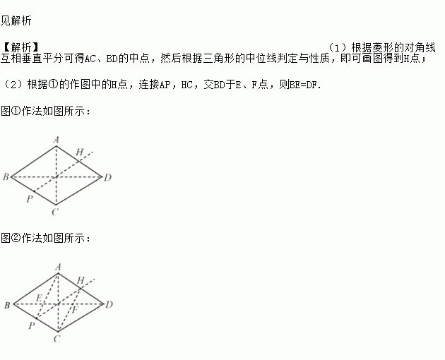 (2)在图②中的菱形对角线BD上,找两个点E、F,使BF=DF.