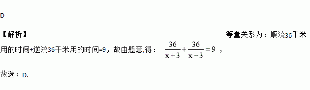 A、B两地相距36千米,一艘小船从A地匀速顺流航行至B地,又立即从B地匀速逆流返回A地,共用去9小时。已知水流速度为3千米/时,若设该轮船在静水中的速度为x千米/时,则求x时所列方程正确的是( )