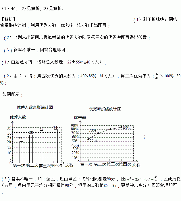(3)已知该班甲同学四次训练成绩为85,95,85,95,乙同学四次成绩分别为85,90,95,90,现需从甲、乙两同学中选派一名同学参加校级比赛,你认为应该选派哪位同学并说明理由.