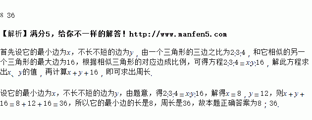 一个三角形的三边之比为,和它相似的另一个三角形的最大边为,则它的最小边的长是________,周长是________.