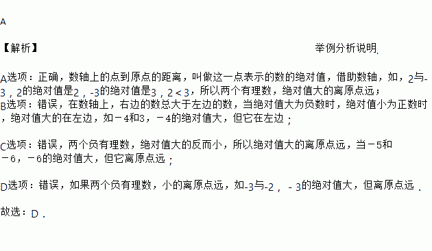 C. 两个负有理数,绝对值大的离原点近 D. 两个有理数,绝对值大的离原点近