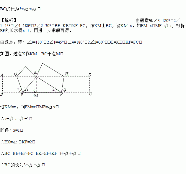 如图,将矩形ABCD(纸片)折叠,使点B与AD边上的点K重合,EG为折痕;点C与AD边上的点K重合,FH为折痕.已知∠1=67.5°,∠2=75°,EF=+1,求BC的长.