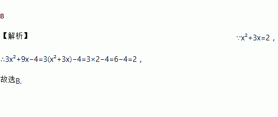 B 【解析】∵x²+3x=2, ∴3x²+9x?4=3(x²+3x)?4=3×2?4=6?4=2, 故选B.