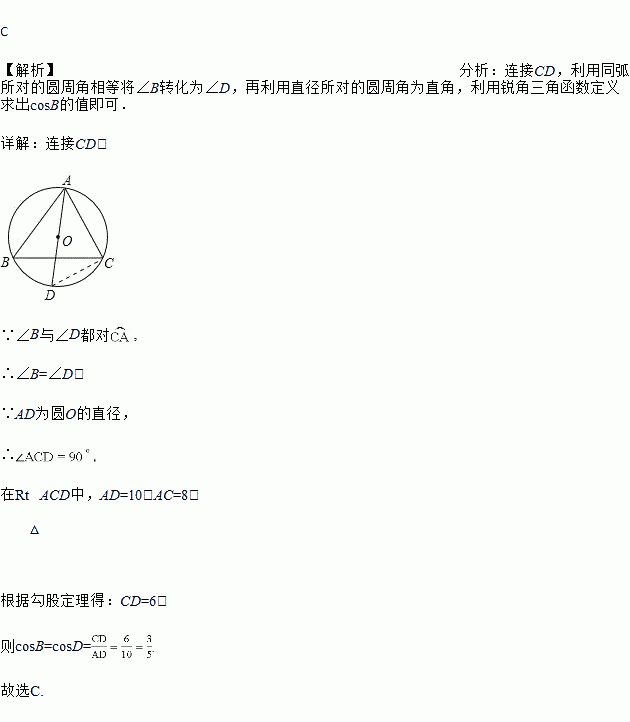 如图,⊙O是△ABC的外接圈,AD为⊙O的直径,若AD=10,AC=8,则cosB等于( )