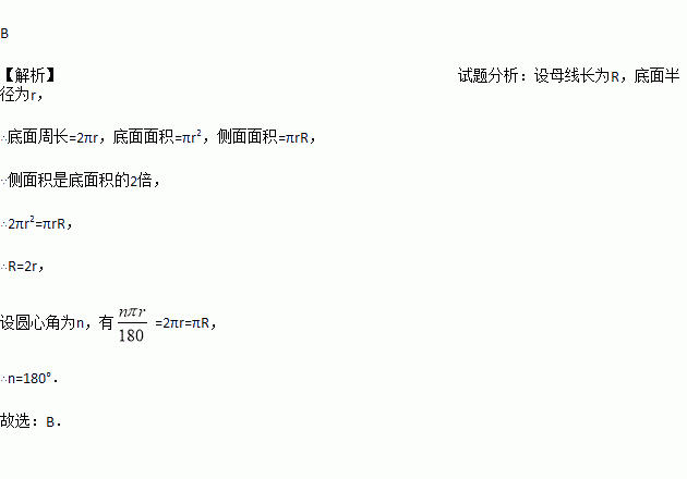 若一个圆锥的侧面积是底面积的2倍,则圆锥侧面展开图的扇形的圆心角为 ( )