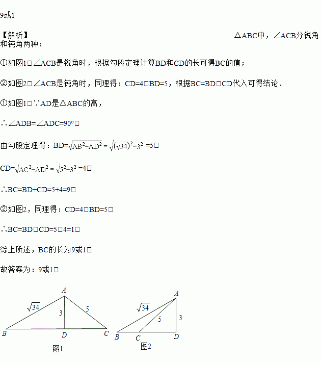 在△ABC中,AB=,AC=5,若BC边上的高等于3,则BC边的长为_____.