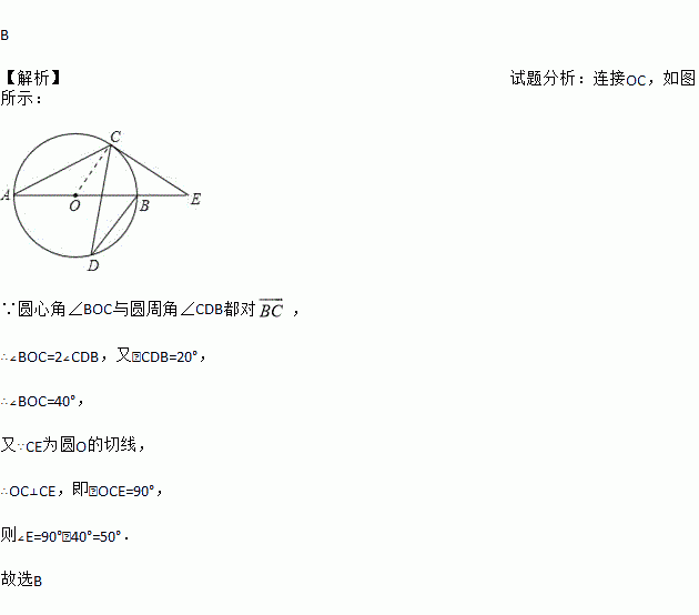 如图,AB是⊙O的直径,C、D是⊙O上一点,∠CDB=20°,过点C作⊙O的切线交AB的延长线于点E,则∠E等于( )