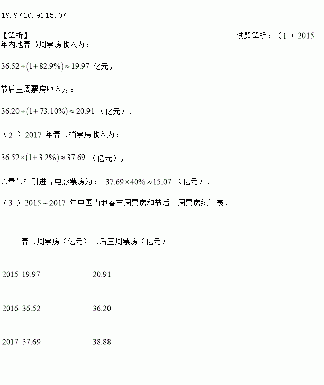 年中国内地春节周票房收入为__________亿元,节后三周票房收入__________亿元.