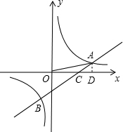 分析:(1)根据∠AOC的正切值,可设出点A的坐标,利用OA的长结合勾股定理可确定点A的坐标,进而可确定反比例函数的解析式;然后将B点坐标代入,即可得到点B的坐标,即可利用待定系数法求得直线的解析式.
