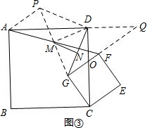 (3)连接GM到点P,使得PM=GM,延长GF、AD交于点Q,连接AP,DP,DM如图③,易证△APD≌△CGD,则有PD=DG,根据等腰三角形的性质可得DM⊥PG,根据直角三角形斜边上的中线等于斜边的一半可得MN=$\frac{1}{2}$DG.要求MN的最大值和最小值,只需求DG的最大值和最小值,由GC=CE=3可知点G在以点C为圆心,3为半径的圆上,再由DC=BC=7,就可求出DG的最大值和最小值.