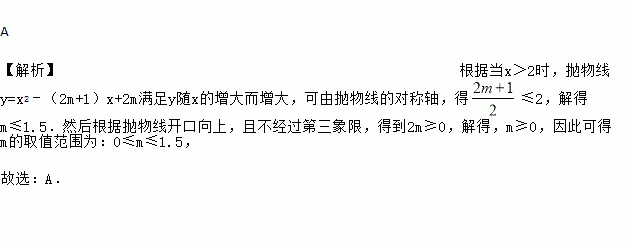 A 【解析】根据当x>2时,抛物线y=x2﹣(2m+1)x+2m满足y随x的增大而增大,可由抛物线的对称轴,得≤2,解得m≤1.5.然后根据抛物线开口向上,且不经过第三象限,得到2m≥0,解得,m≥0,因此可得m的取值范围为:0≤m≤1.5, 故选:A.