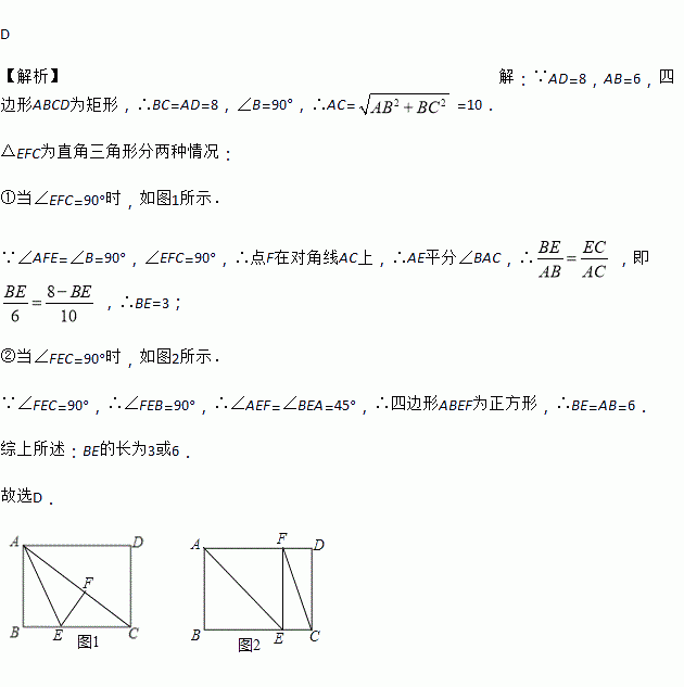 在矩形纸片ABCD中,AD=8,AB=6,E是边BC上的点,将纸片沿AE折叠,使点B落在点F处,连接FC,当△EFC为直角三角形时,BE的长为( )