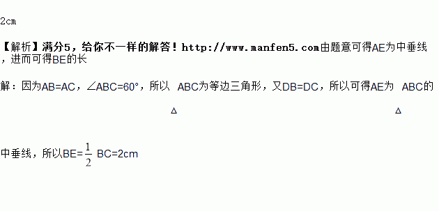 如图,AB=AC=4cm,DB=DC,若∠ABC为60°,则BE为________.