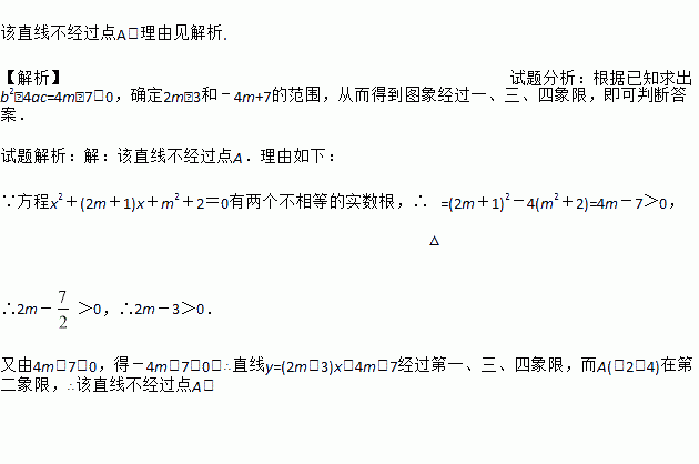已知关于x的方程x2+(2m+1)x+m2+2=0有两个不相等的实数根,试判断直线y=(2m-3)x-4m+7能否经过点A(-2,4),并说明理由.