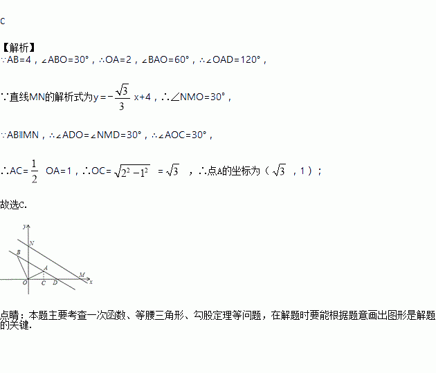 分别与x轴、y轴交于点M、N,点A、B分别在y轴、x轴上,且∠ABO=30°,AB=4,将△ABO绕原点O顺时针旋转180°,在旋转过程中,当AB与直线MN平行时点A的坐标为( )