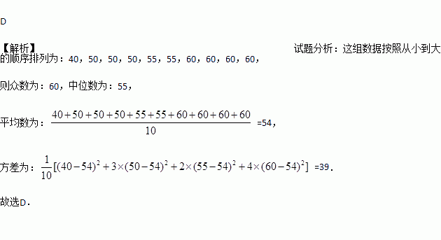 A. 中位数是55 B. 众数是60 C. 平均数是54 D. 方差是29