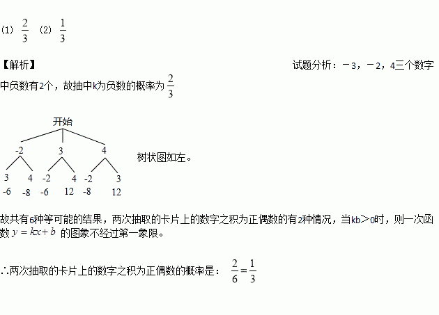 标有-3,-2,4的三张不透明的卡片,除正面写有不同的数字外,其余的值都相同,将这三张卡片背面朝上洗匀后,第一次从中随机抽取一张,并把这张卡片标有的数字记为一次函数解析式y=kx+b的k值,第二次从余下的两张卡片中再抽取一张,上面标有的数字记为一次函数解析式的b值.