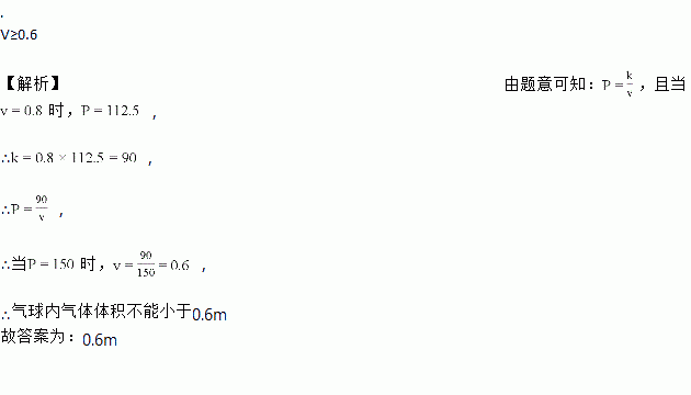 某气球内充满一定质量的气体,当温度不变时,气球内气体的压强p(kPa)与气体的体积V(m3)成反比例.当气体的体积V=0.8m3时,气球内气体的压强p=112.5kPa.当气球内气体的压强大于150kPa时,气球就会爆炸.那么气球内气体的体积应不小于(____)m3气球才不会爆炸.