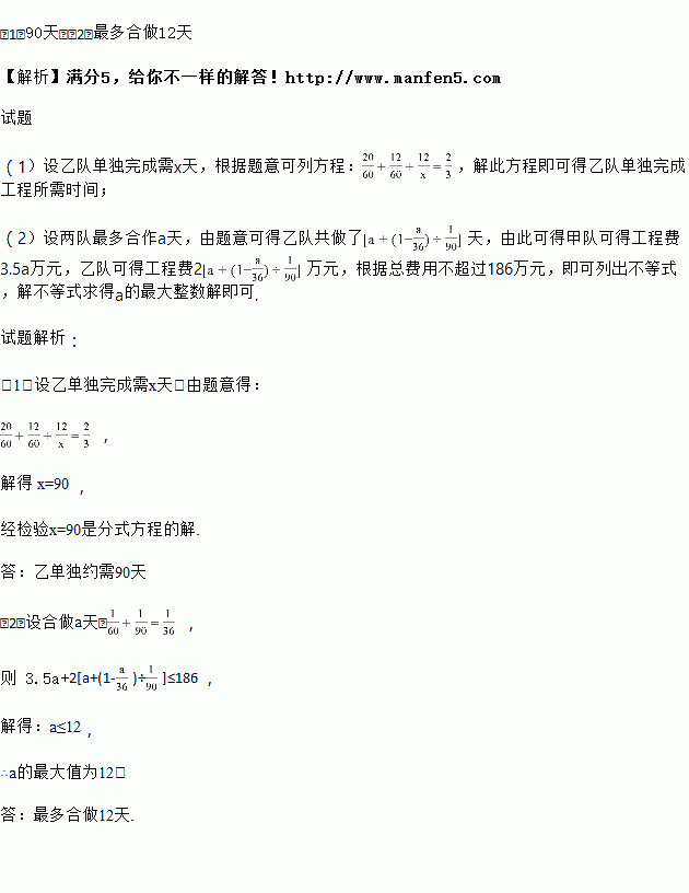 (2)甲队施工l天需付工程款3.5万元,乙队施工一天需付工程款2万元,该工程由甲乙两队合作若干天后,再由乙队完成剩余工作,若要求完成此项工程的工程款不超过186万元,求甲、乙两队最多合作多少天?